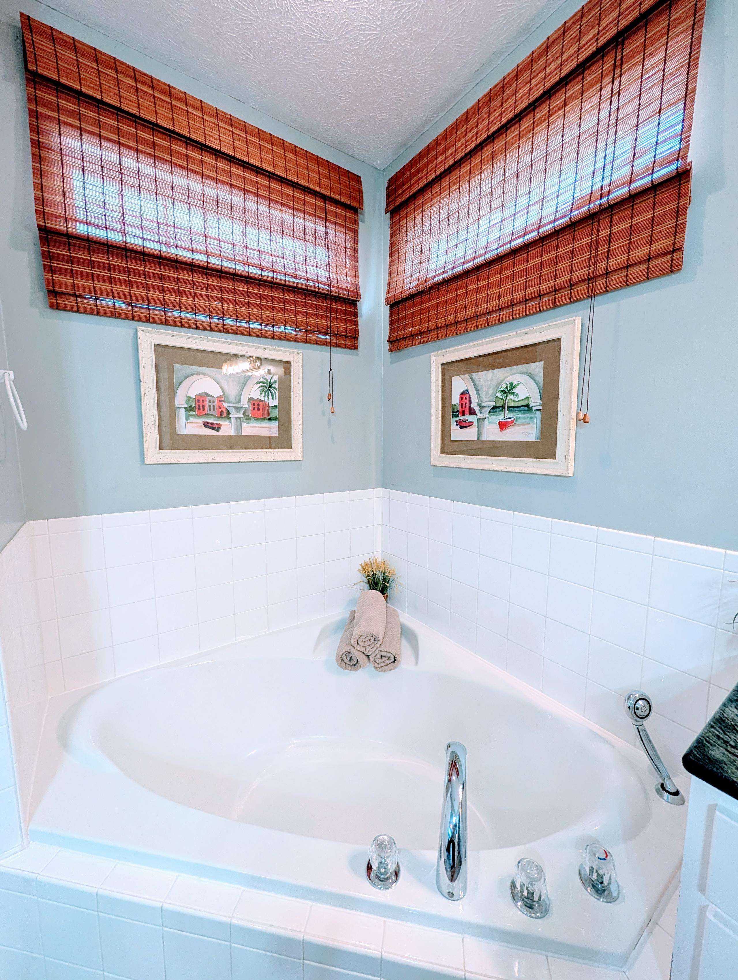 Soaking tub retreat with soft natural light and cozy accents