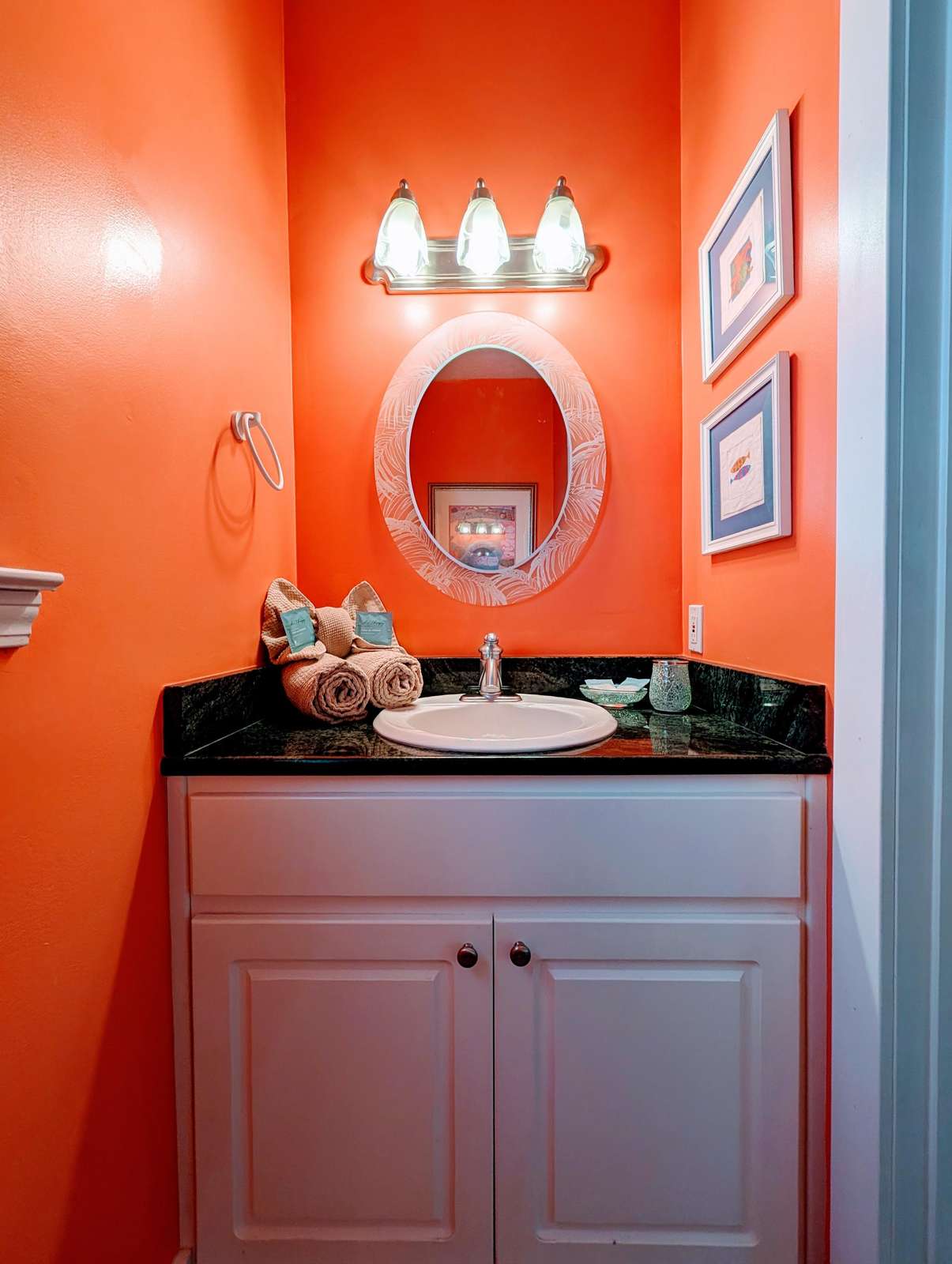 Bright and bold powder room with modern vanity lighting