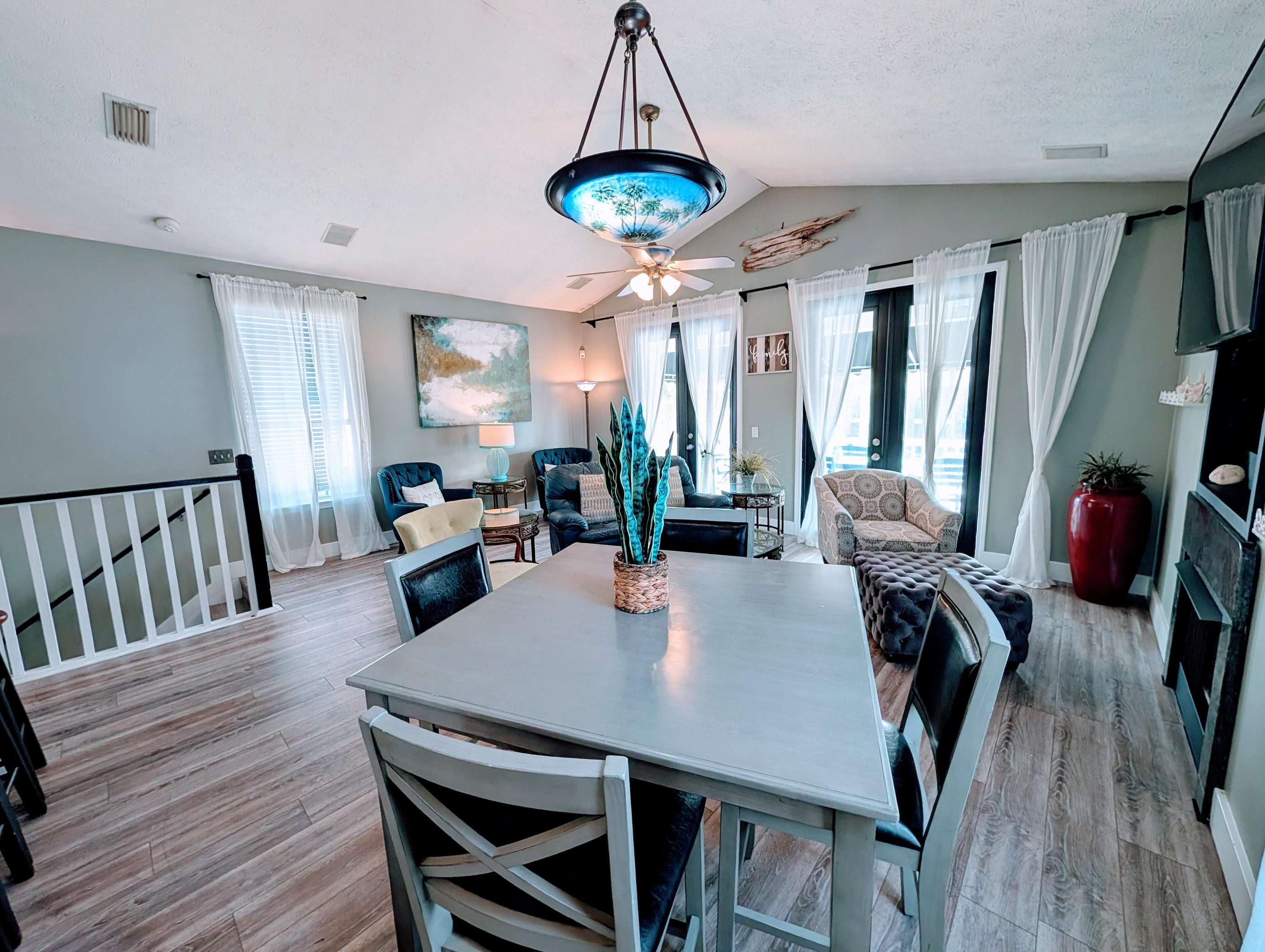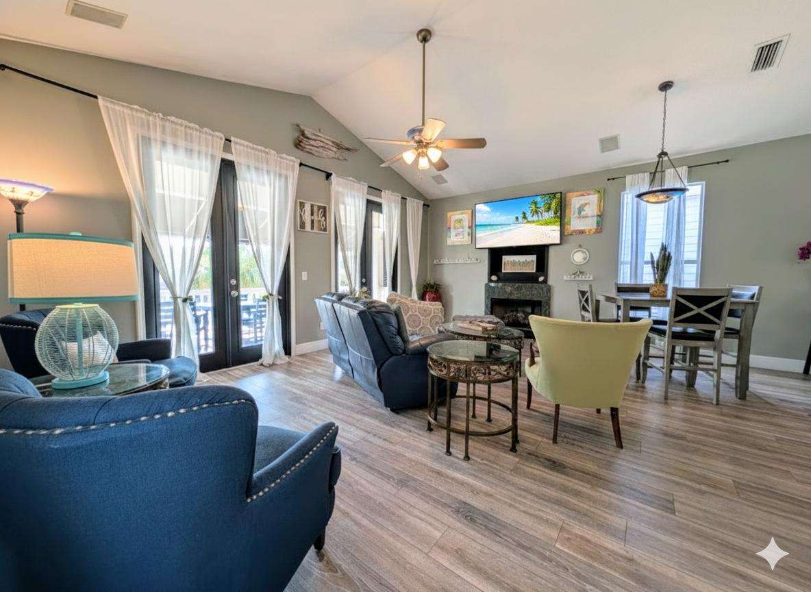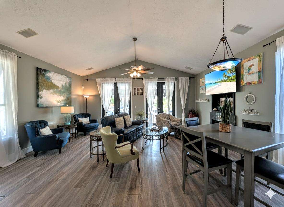 Spacious open-concept living and dining area with cozy seating