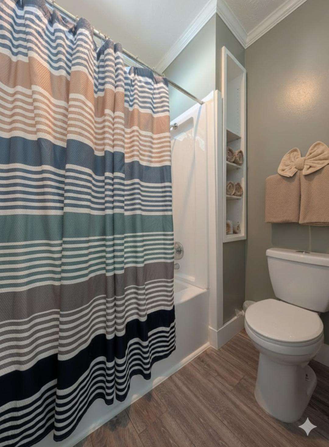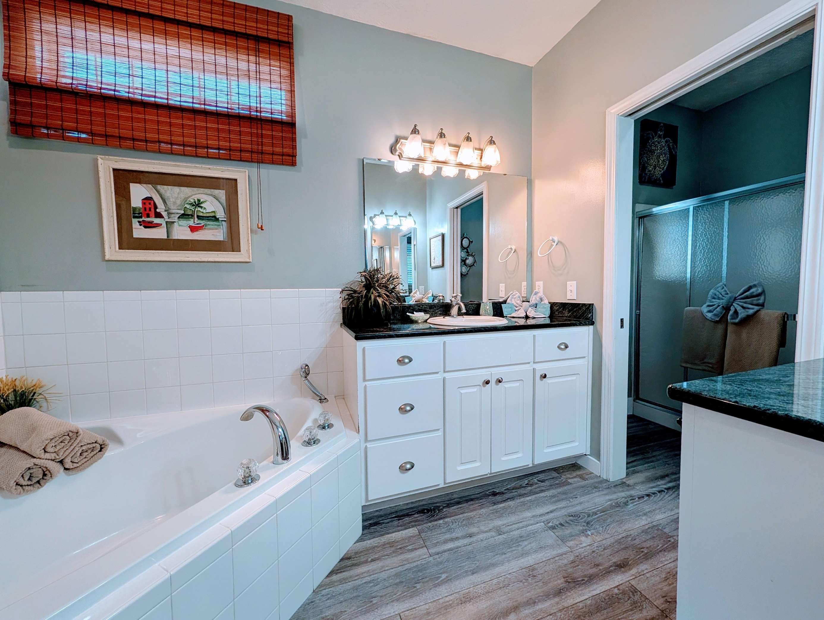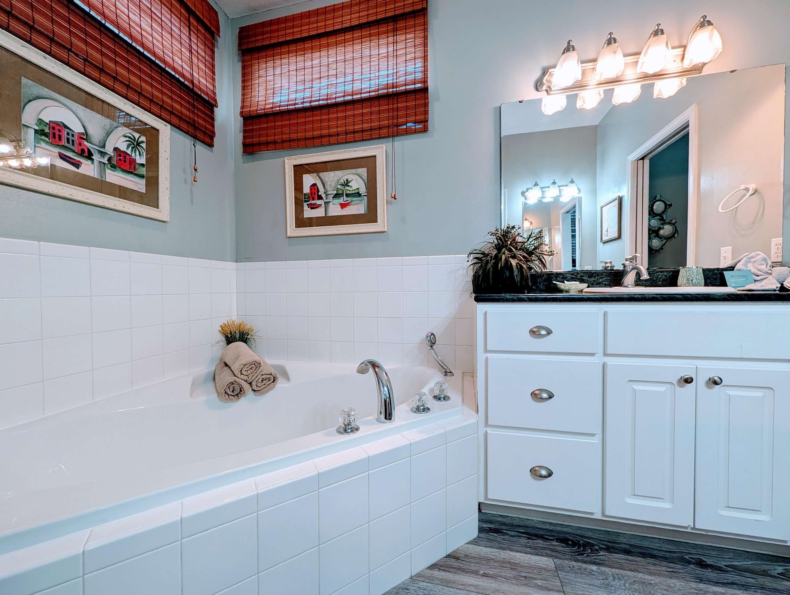 Cozy, bright bathroom with modern flooring and decor