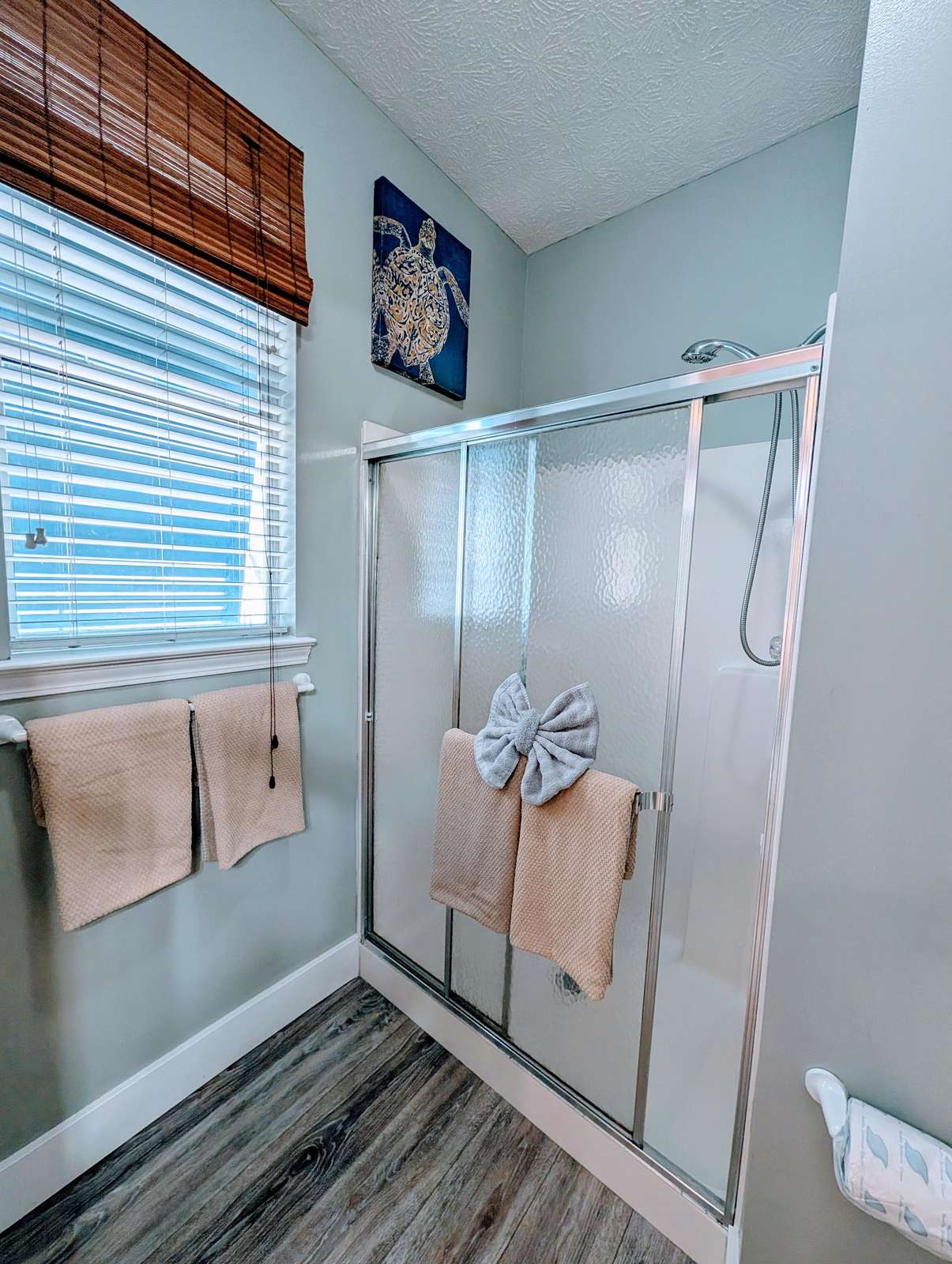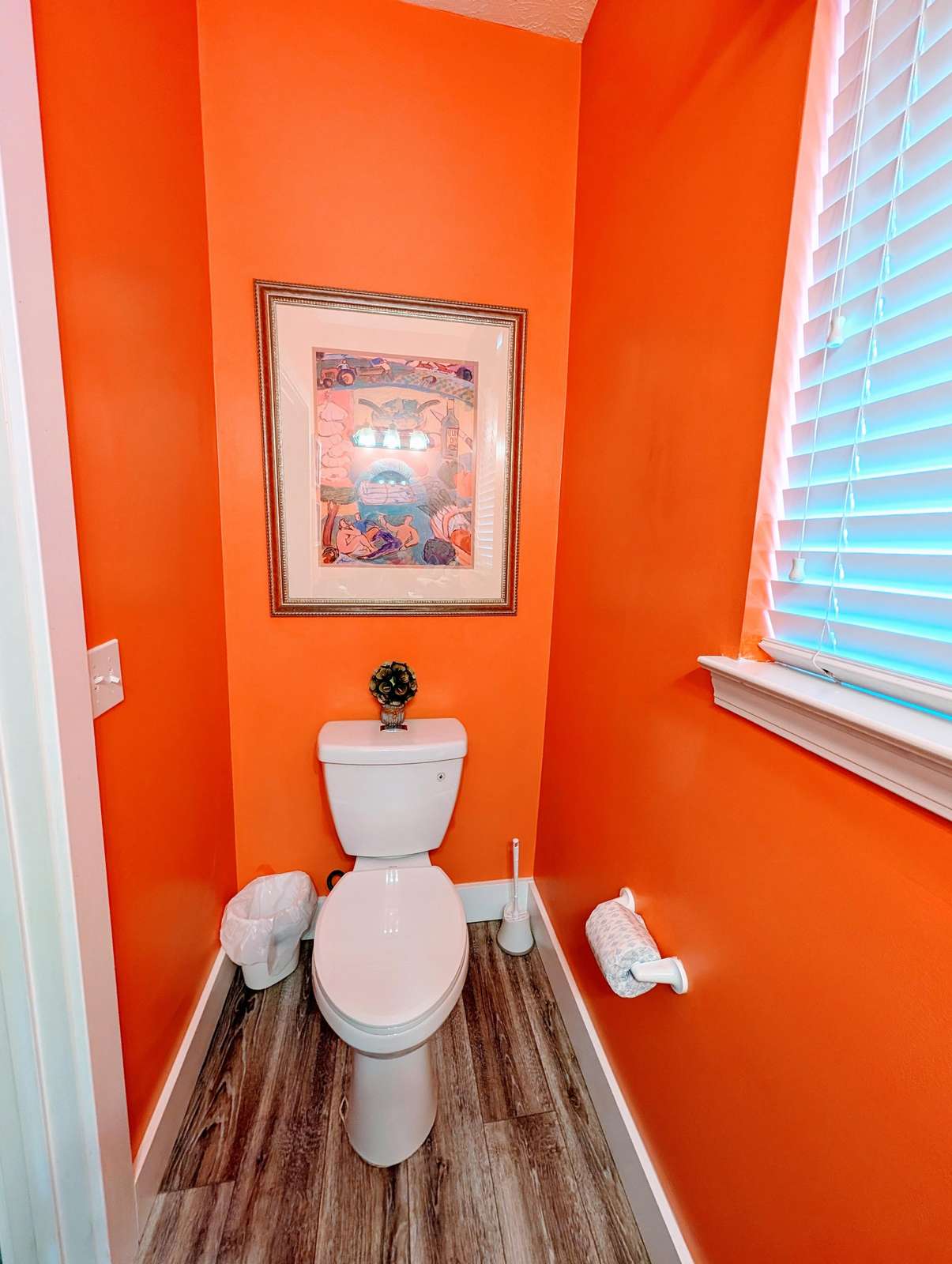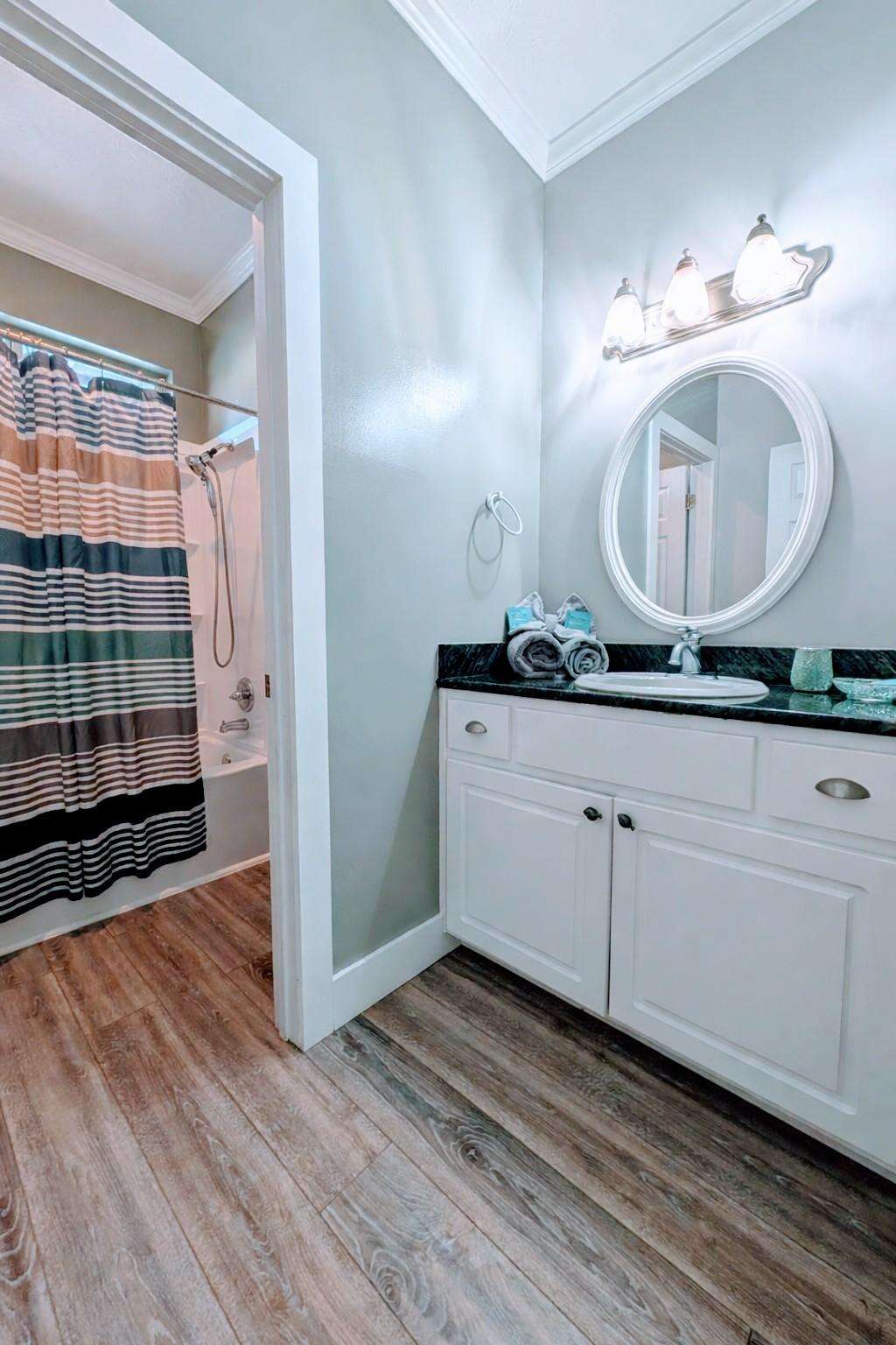 Cozy, bright bathroom with modern flooring and decor
