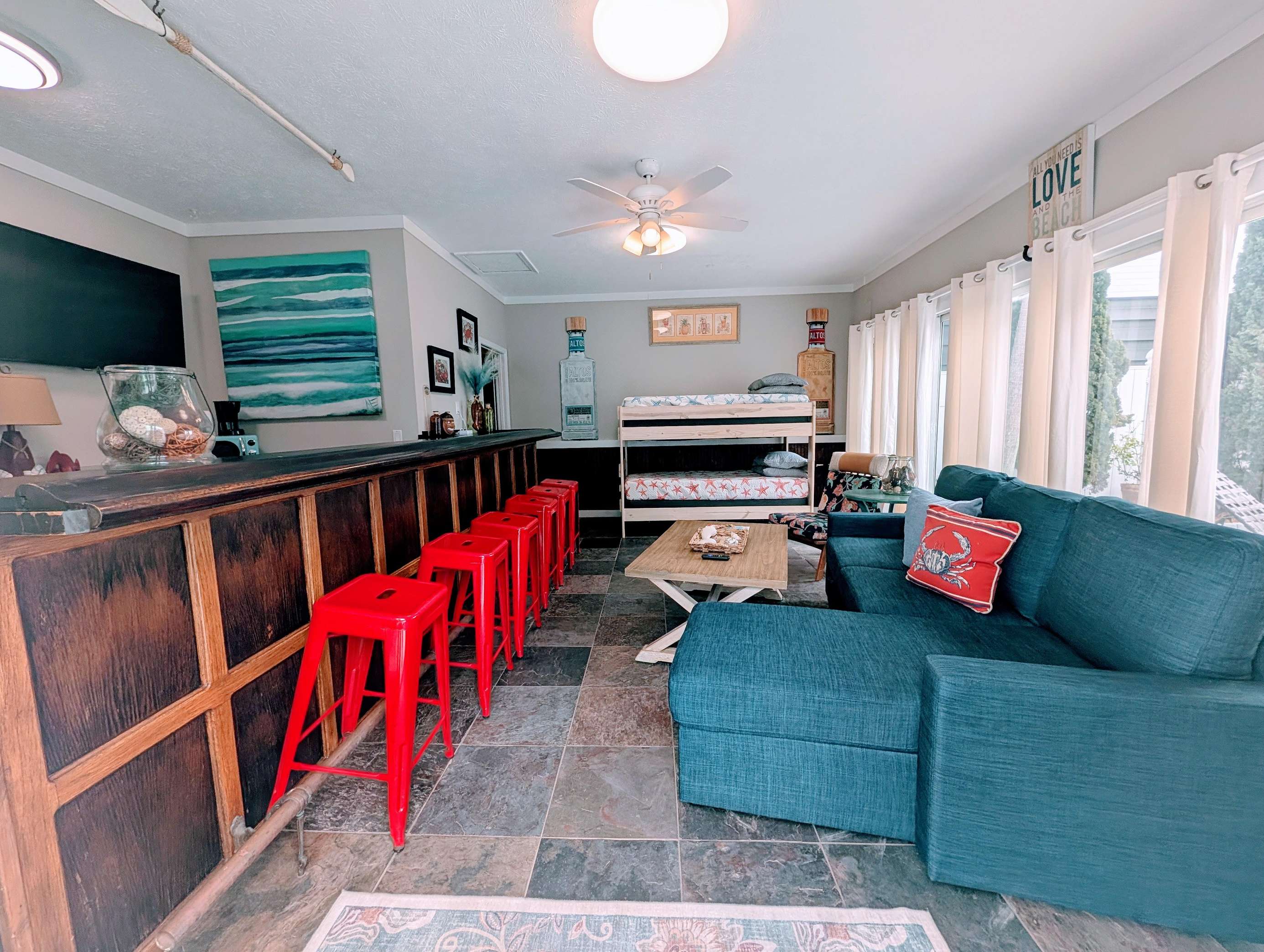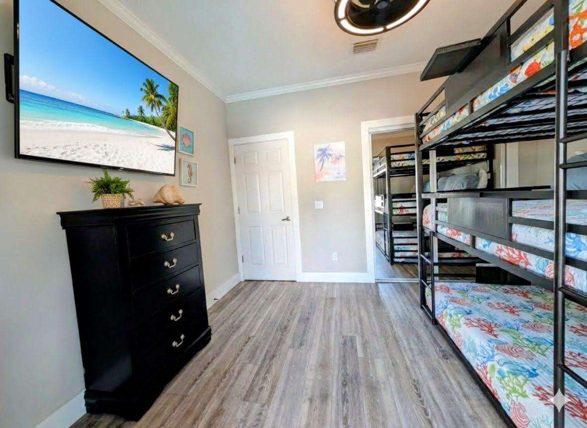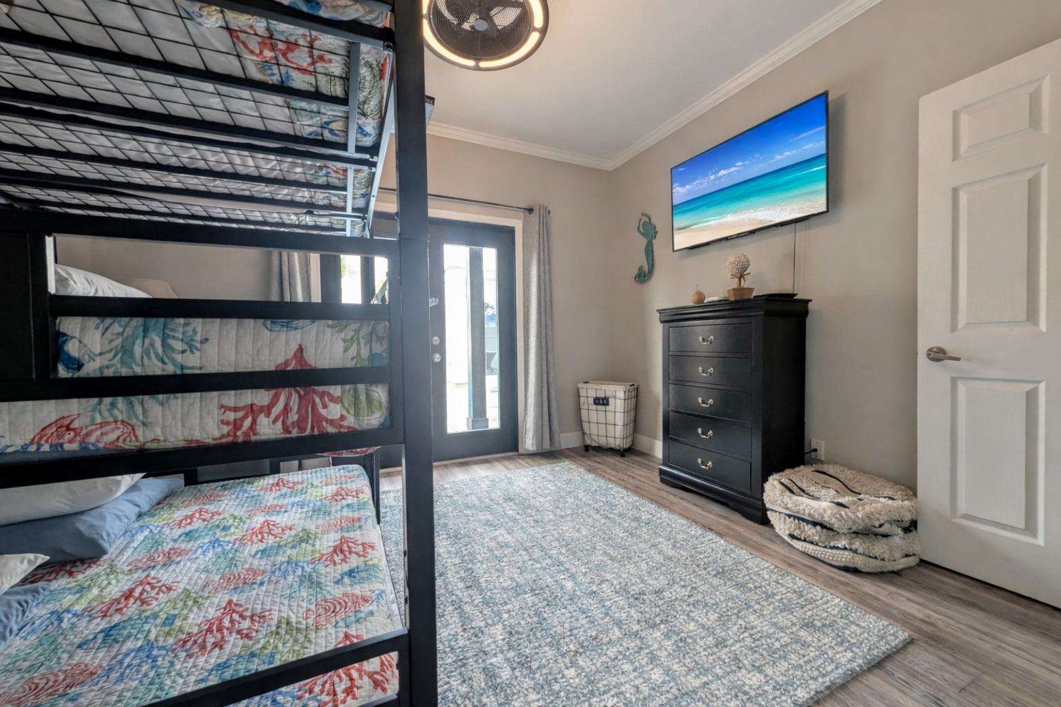 Bright bunk room with smart TV and ample storage