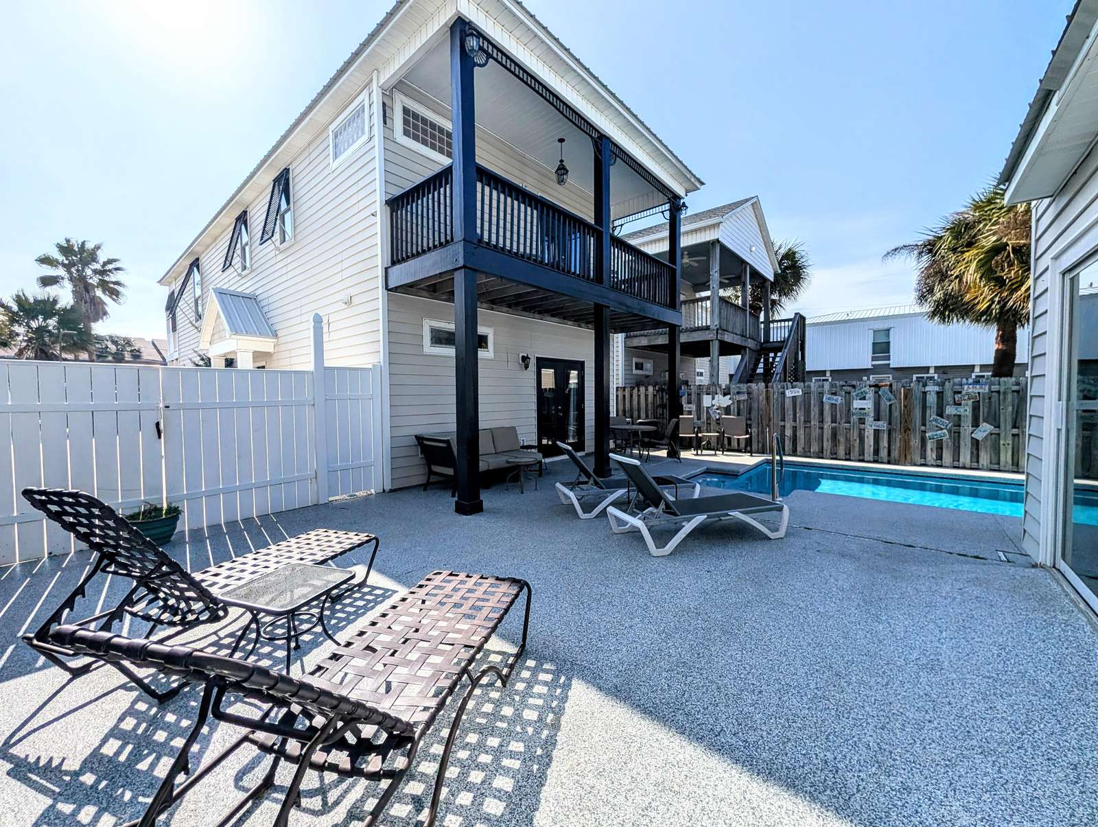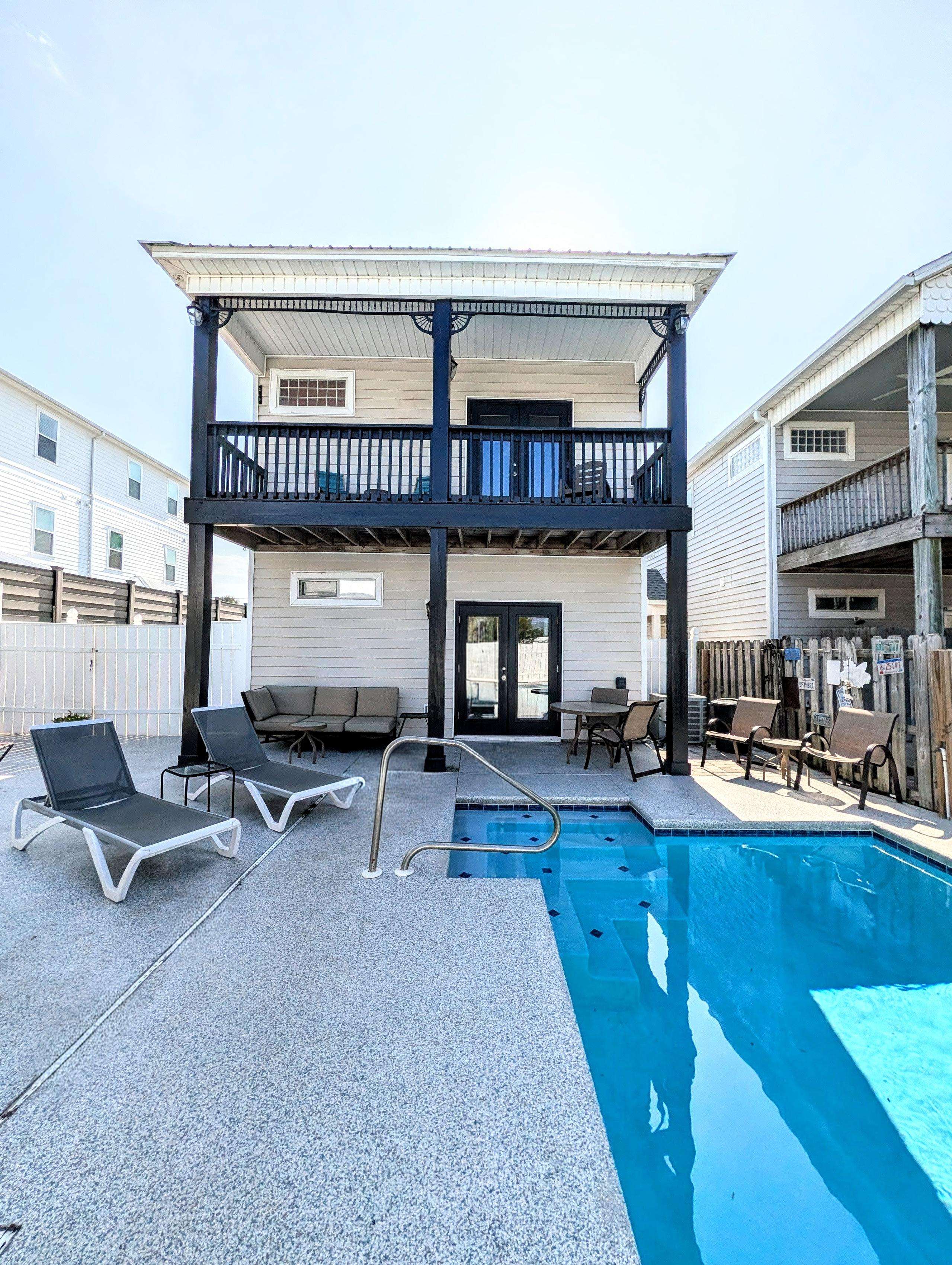 Sleeps 12 comfortably!! THIS is THE Perfect Beach Vacation Home Steps from the sand! This spacious home offers ample space for everyone, comfortably sleeping 12. The unique features include a separate private pool house with a full bathroom, providing extra privacy and flexibility. Entertain and relax in the historic 1800s Chicago Pub bar, and enjoy the convenience of walking distance to local restaurants and nightlife. Ample parking is also available with a two-car garage and a large driveway for RV or camper parking offering ultimate accommodations for a large family or multiple travel parties with 2 separate living spaces! The main house can sleep 10 and Pool Bungalow to sleep 2. Main house boasts 2 levels with large Main Master Bedroom, huge Master Bath with large tub and stand up shower, Kitchen/ Living area and Half Bath all upstairs. Downstairs area has 2 bedrooms; 1 with a King bed and other having a 3 LEVEL Full mattress Bunk option to sleep 6 and 1 full bath. Large 2 car garage, full size washer & Dryer also on 1st level. Walk into the backyard oasis through 2nd bedroom OR though the outside gate to your private pool (heated option available$40/night), tanning deck and Air Conditioned Pool Bungalow with a Historical Bar from an 1800s Chicago Pub with Full Fridge, microwave, coffee maker, 55" TV and Full Bathroom with tub/shower combo. Twin bunks and a futon type couch are the sleeping options here. Tons of cabinets and gathering space. Can sleep up to 14 with the additional pullout to full size mattress couch in Pool Cabana as well as a Full floor mattress in Garage to use where needed.