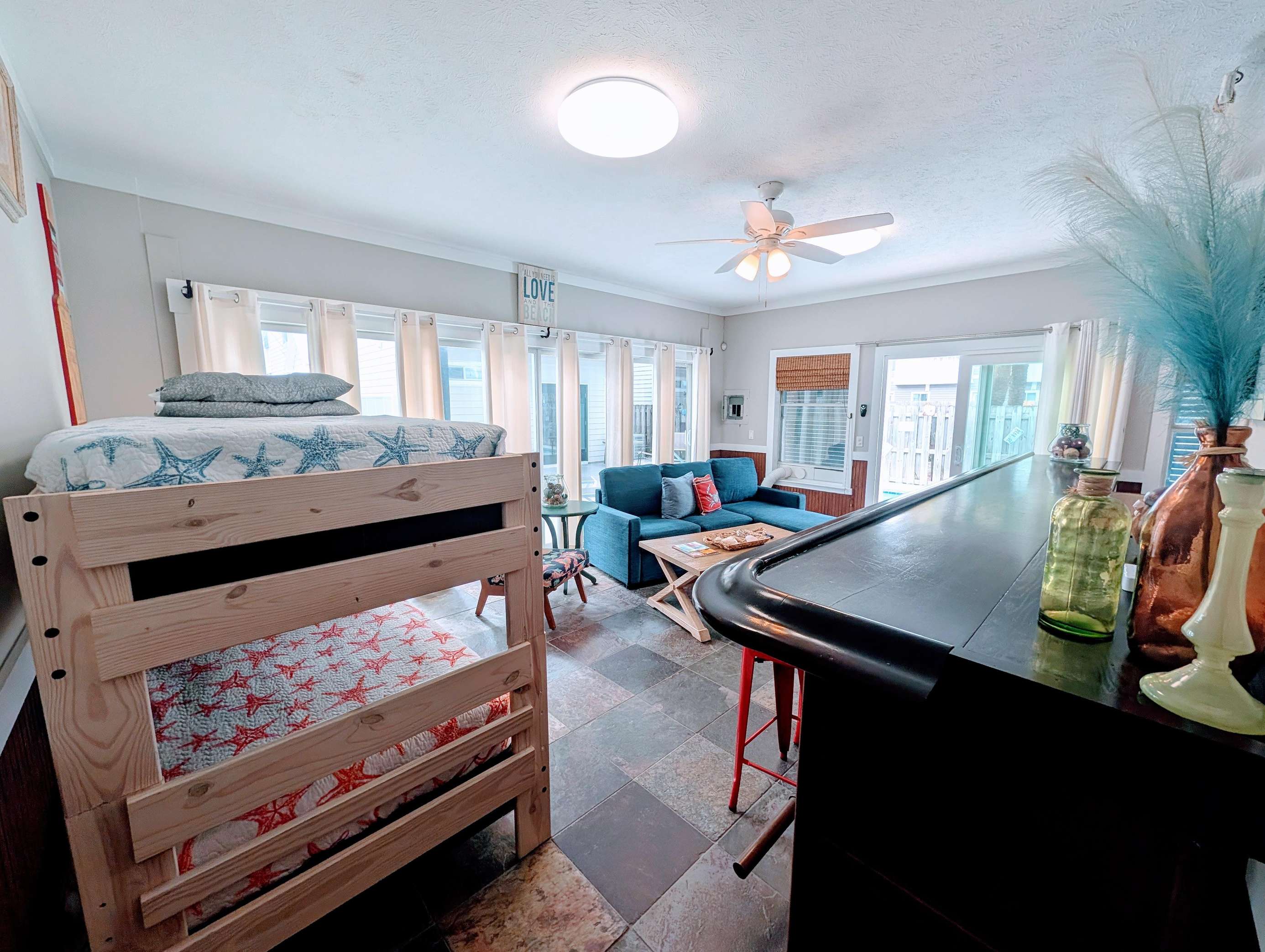 Bright and cozy bunk bedroom with cheerful coastal decor