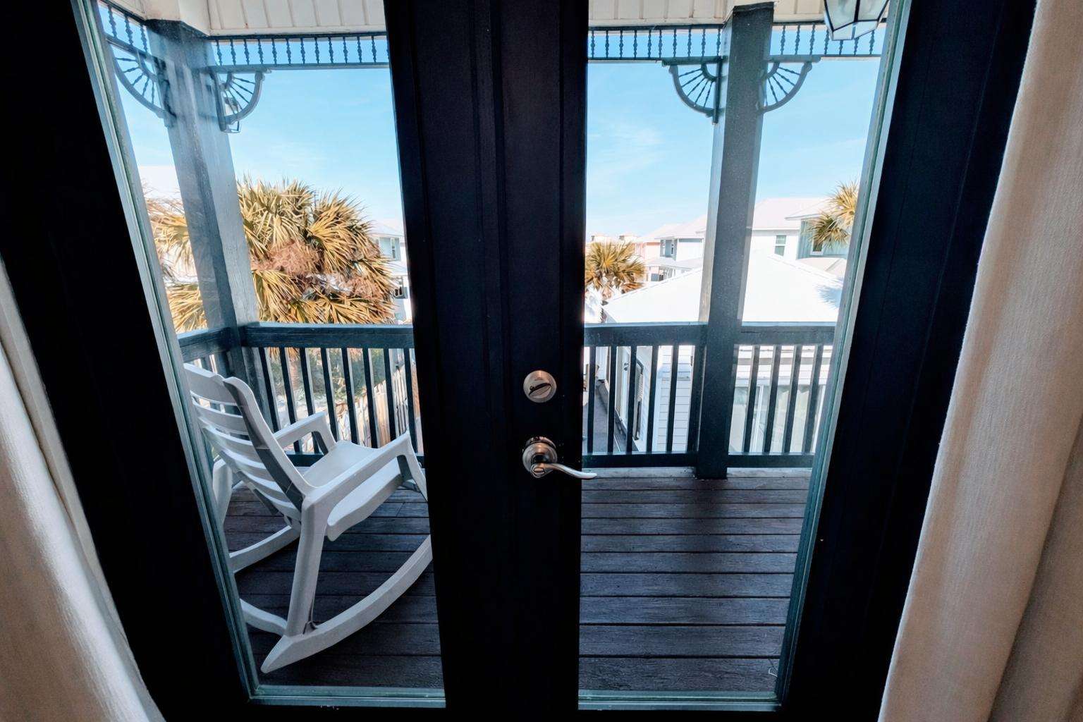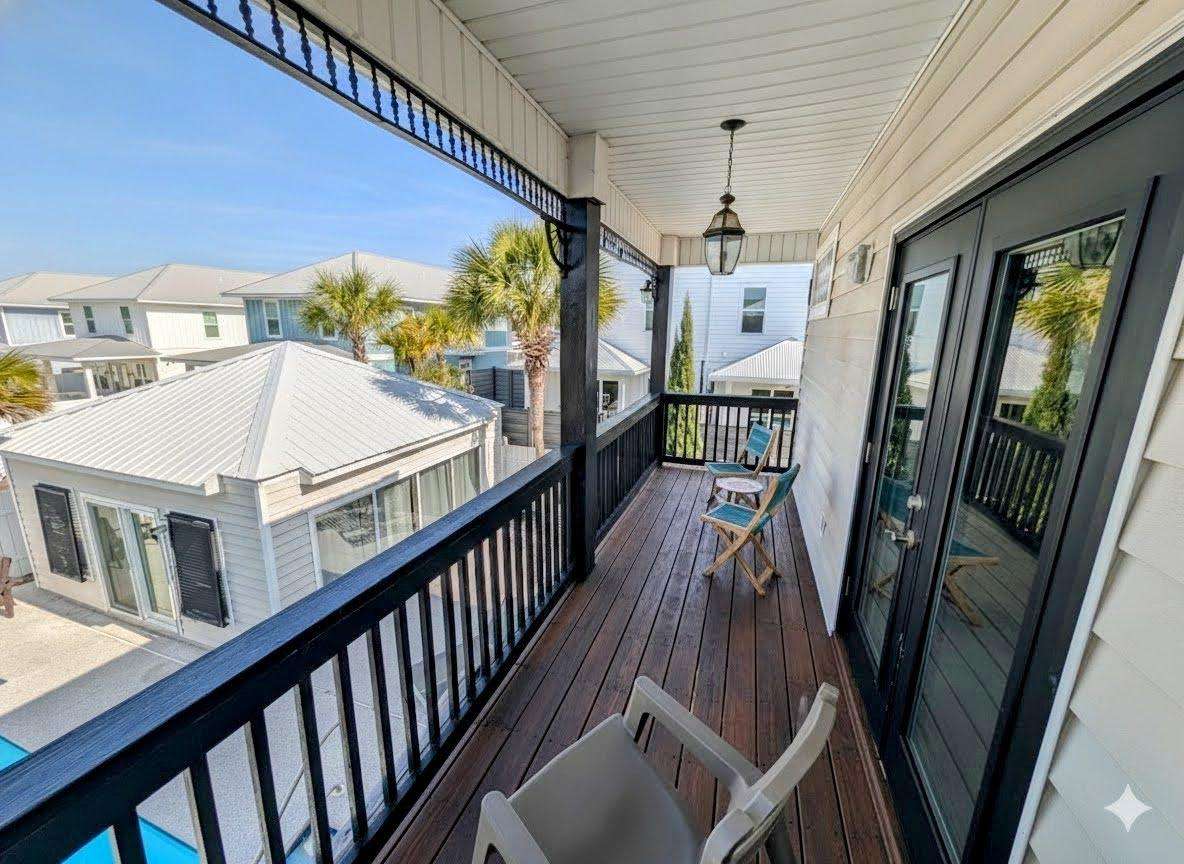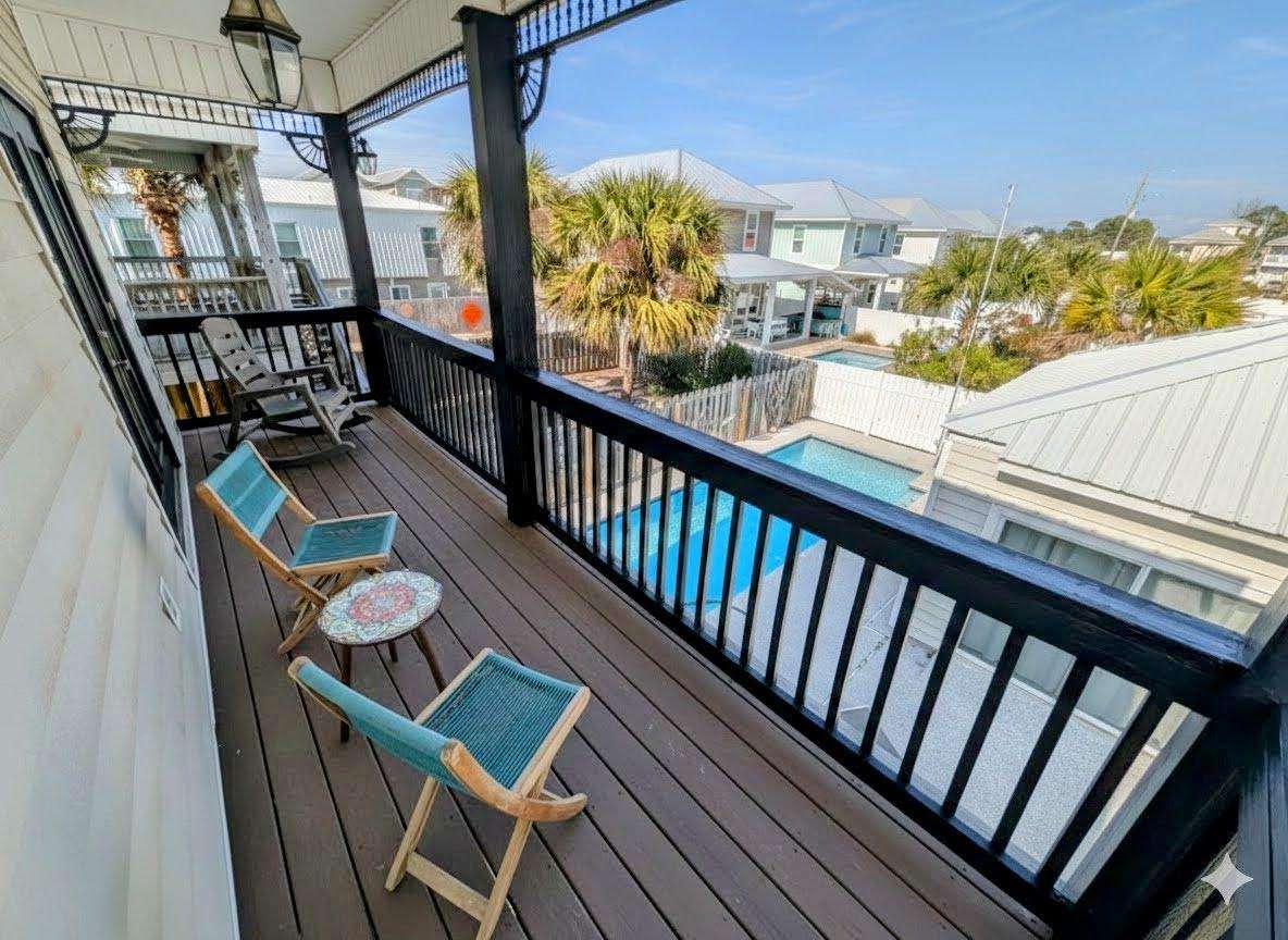 Cozy balcony retreat with pool and neighborhood views