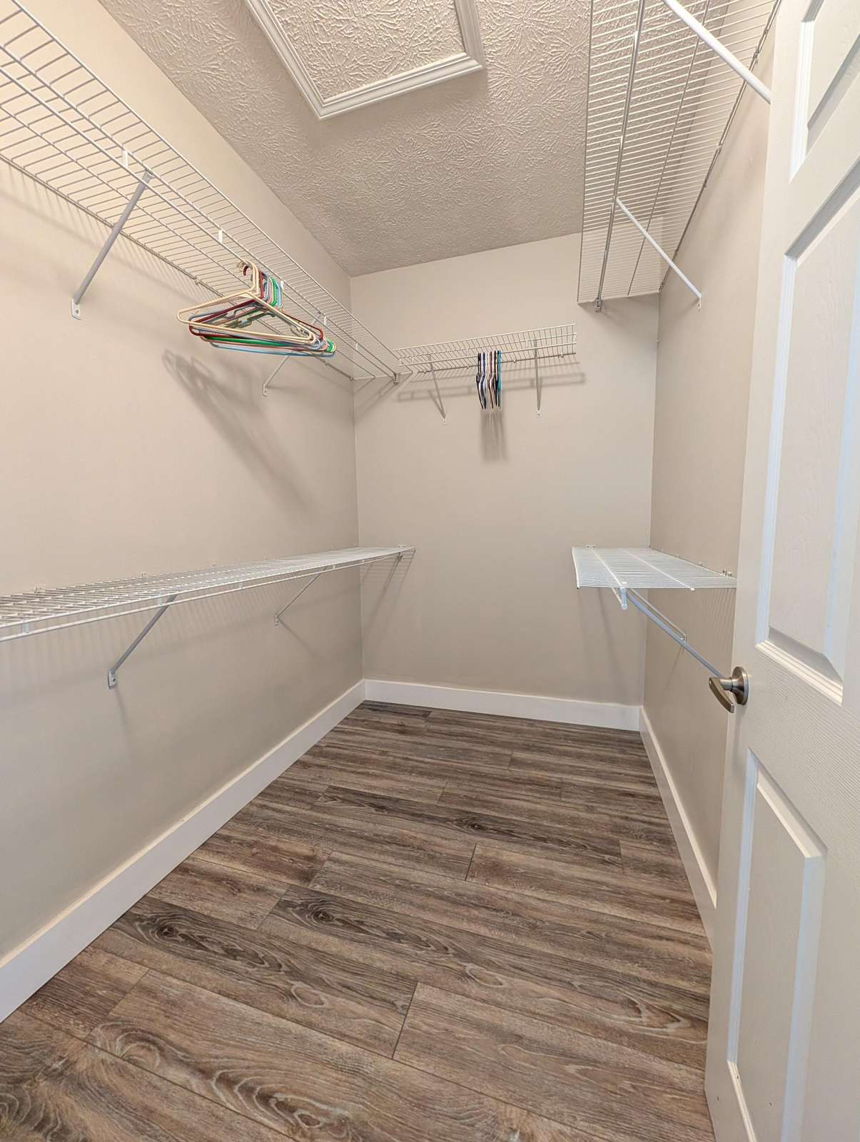 Spacious walk-in closet with modern wood flooring and bright lighting