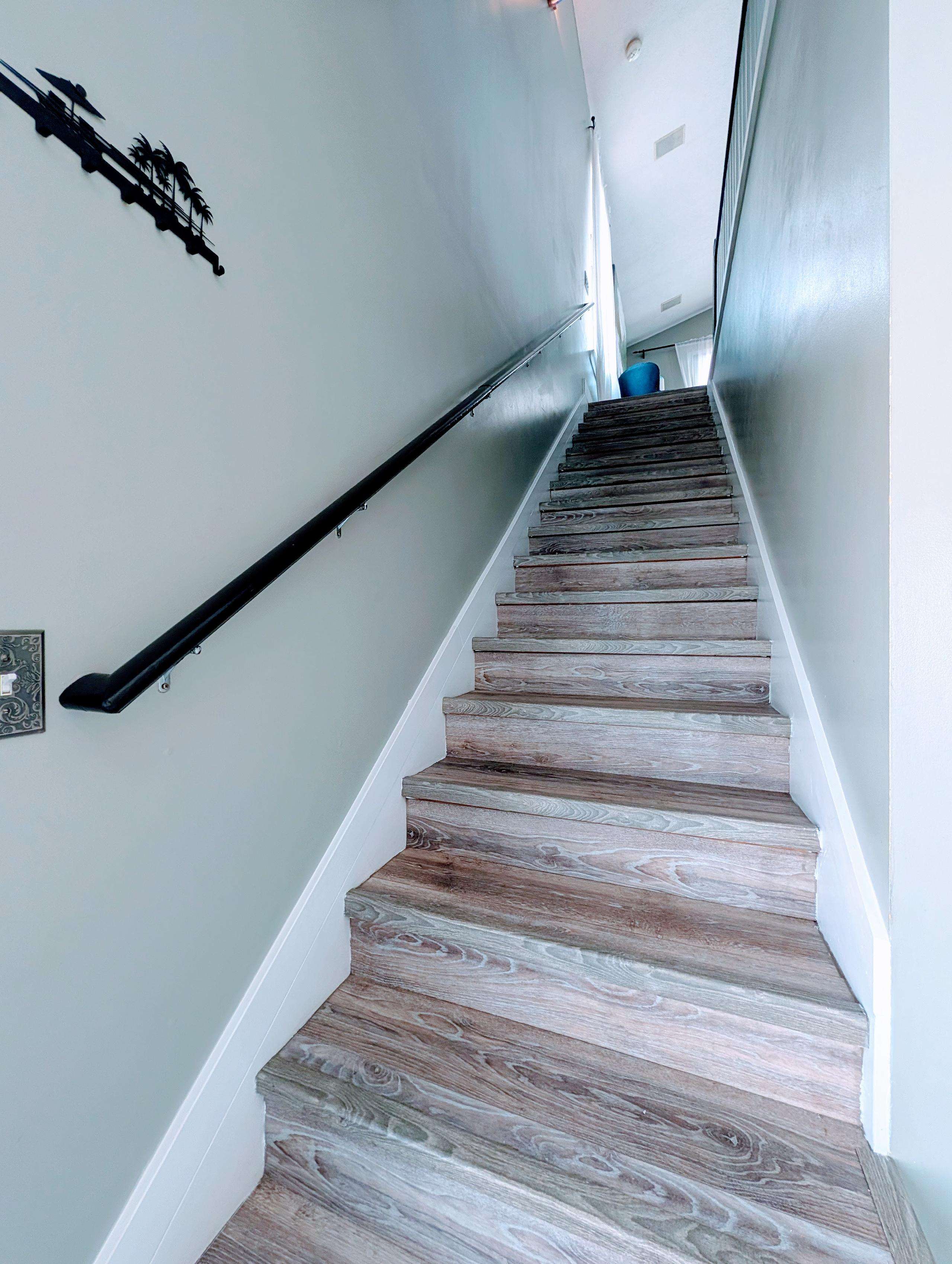 Bright, modern staircase leading to your cozy retreat upstairs