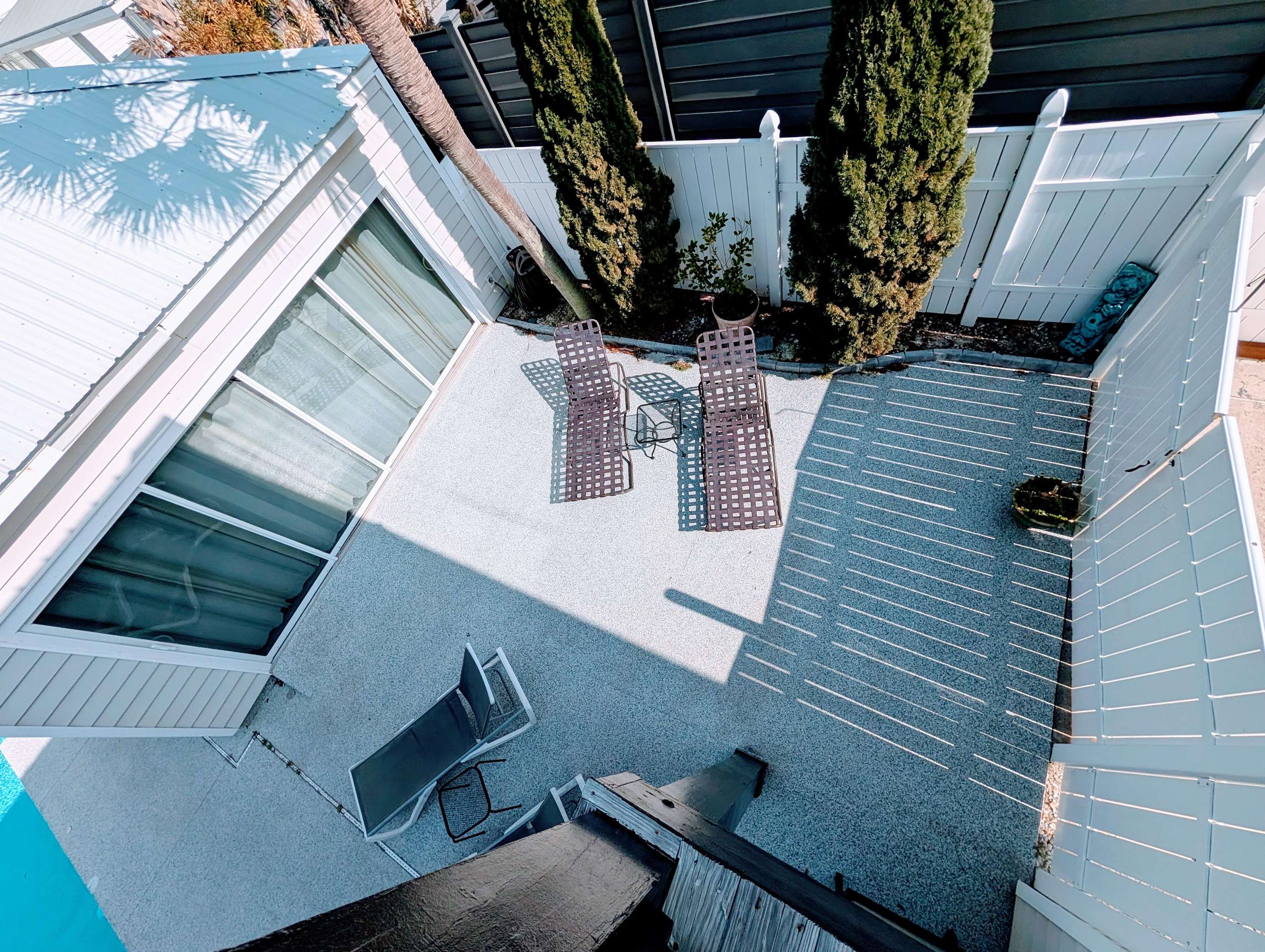 Sunny poolside patio with loungers and shaded balcony