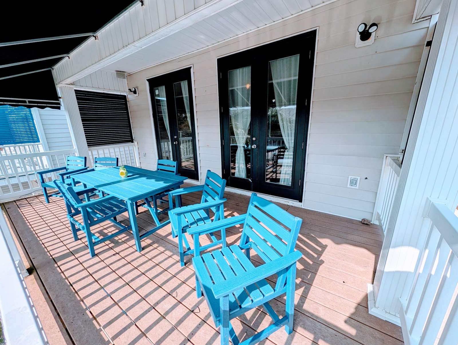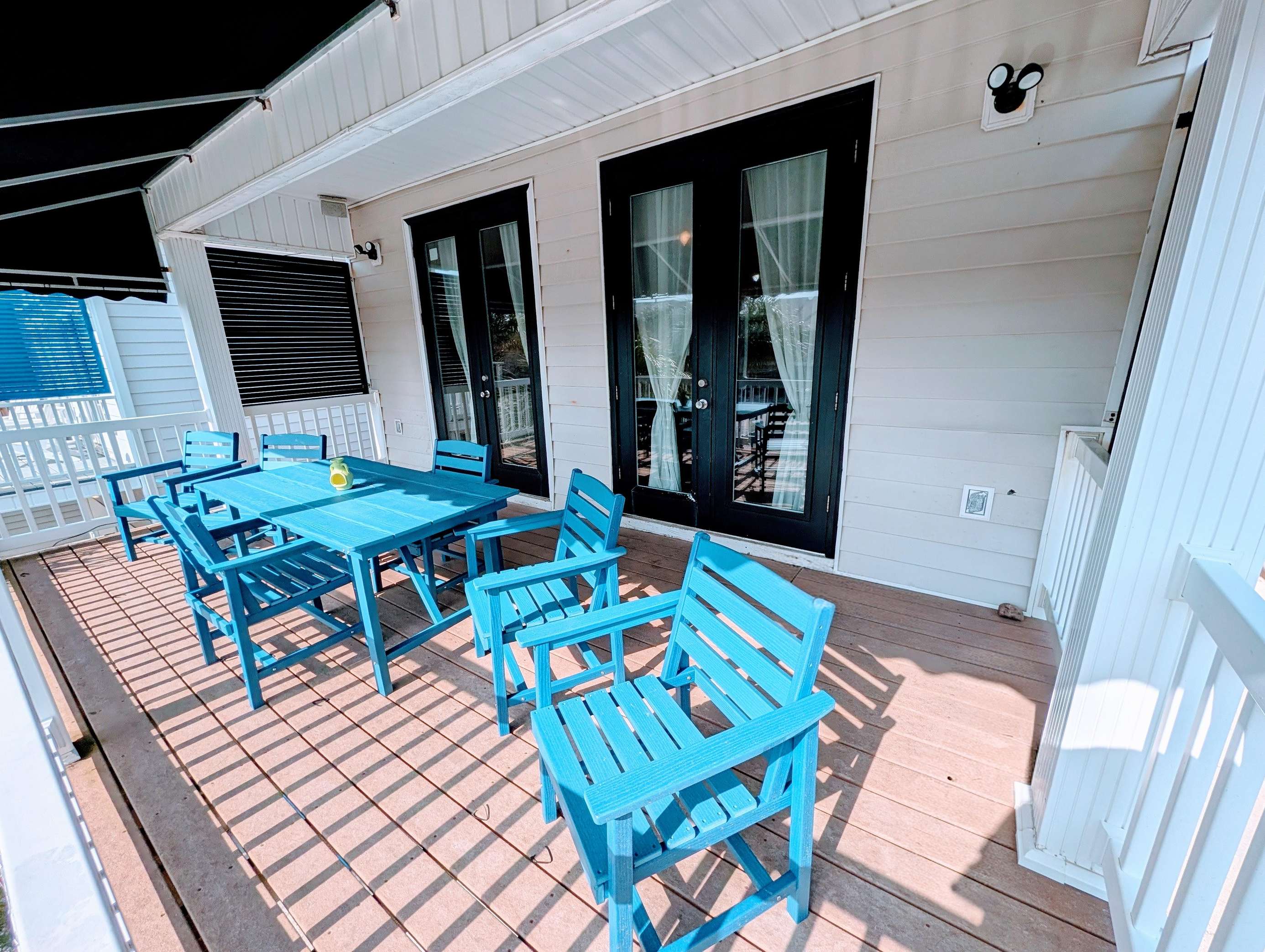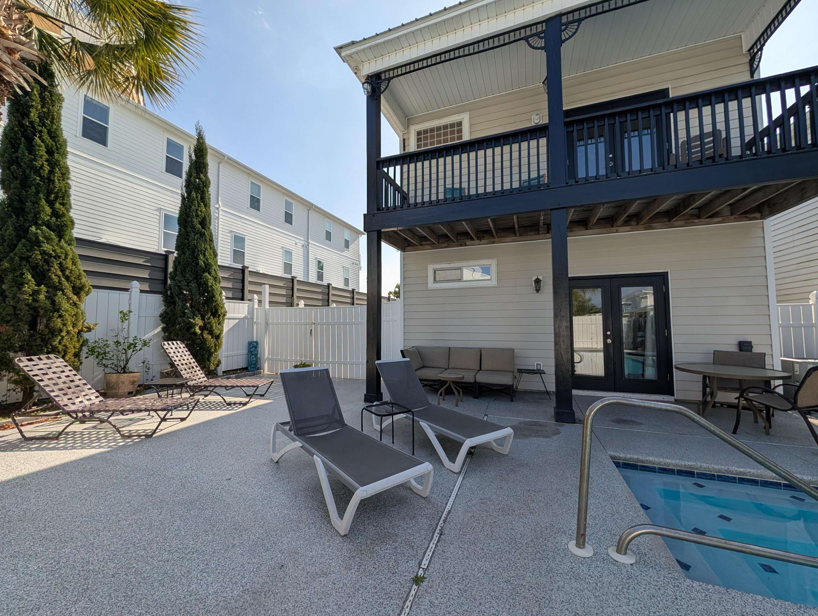 Spacious outdoor patio with cozy seating and sunny lounge chairs