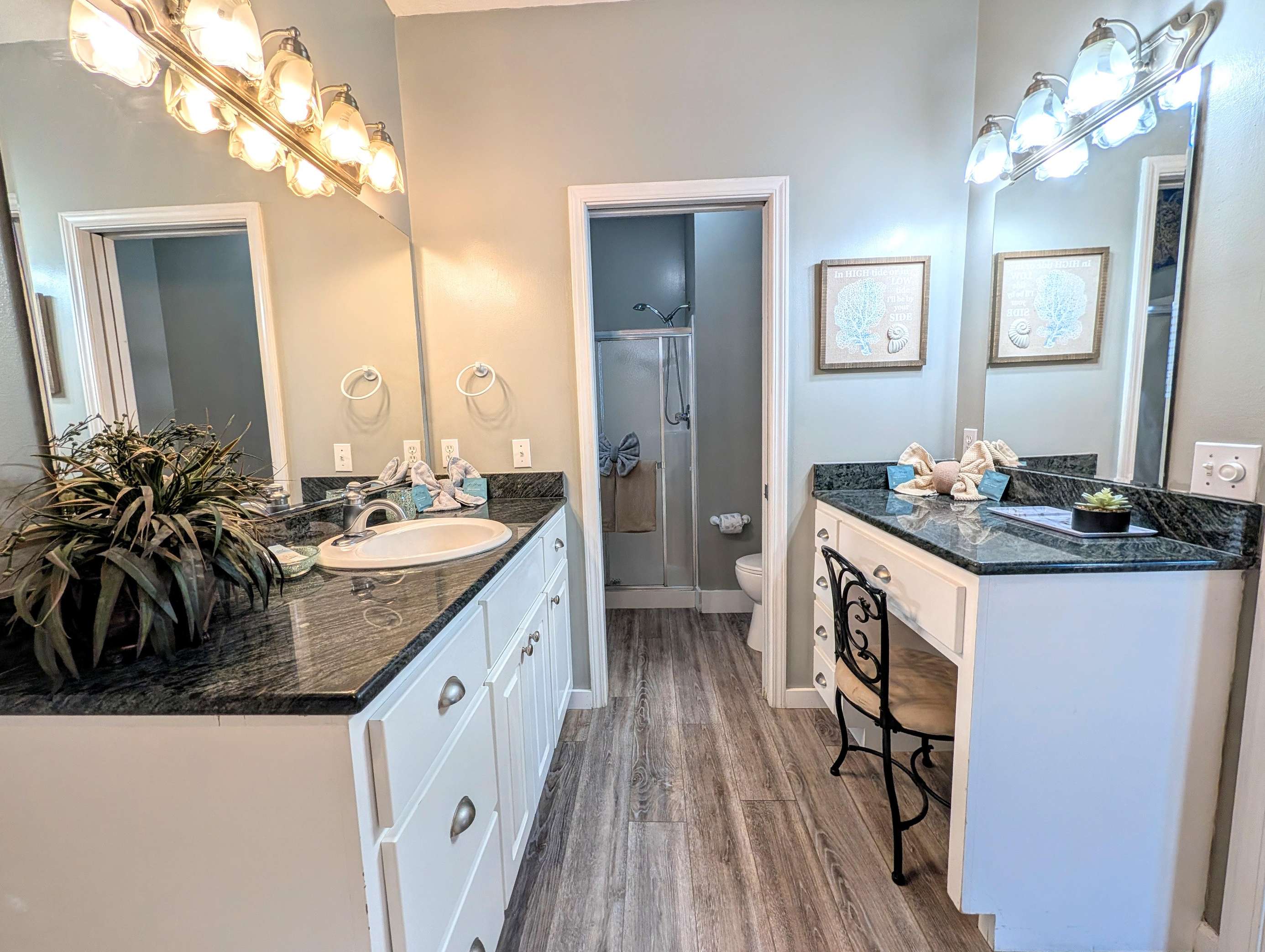 Spacious bathroom with dual vanities and modern lighting