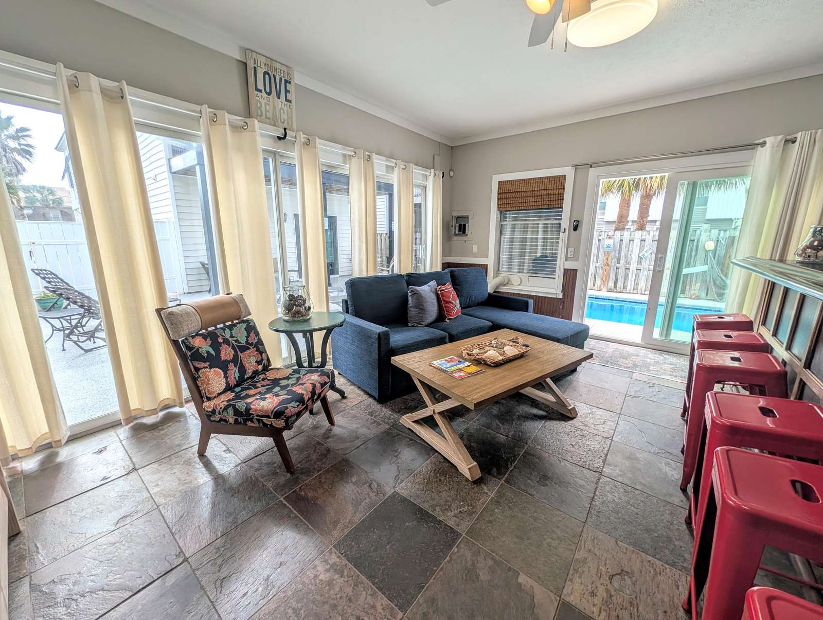 Sunlit living area in Pool Cabana with Couch that transforms into Full Size mattress for extra sleeping